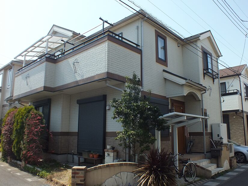 ・上塗り1.2回目 – ニッペ ファインフッソを使用。低汚染性が高く、フッ素という素材の特長もあり、汚れが付きにくく、手入れの回数も減少する。