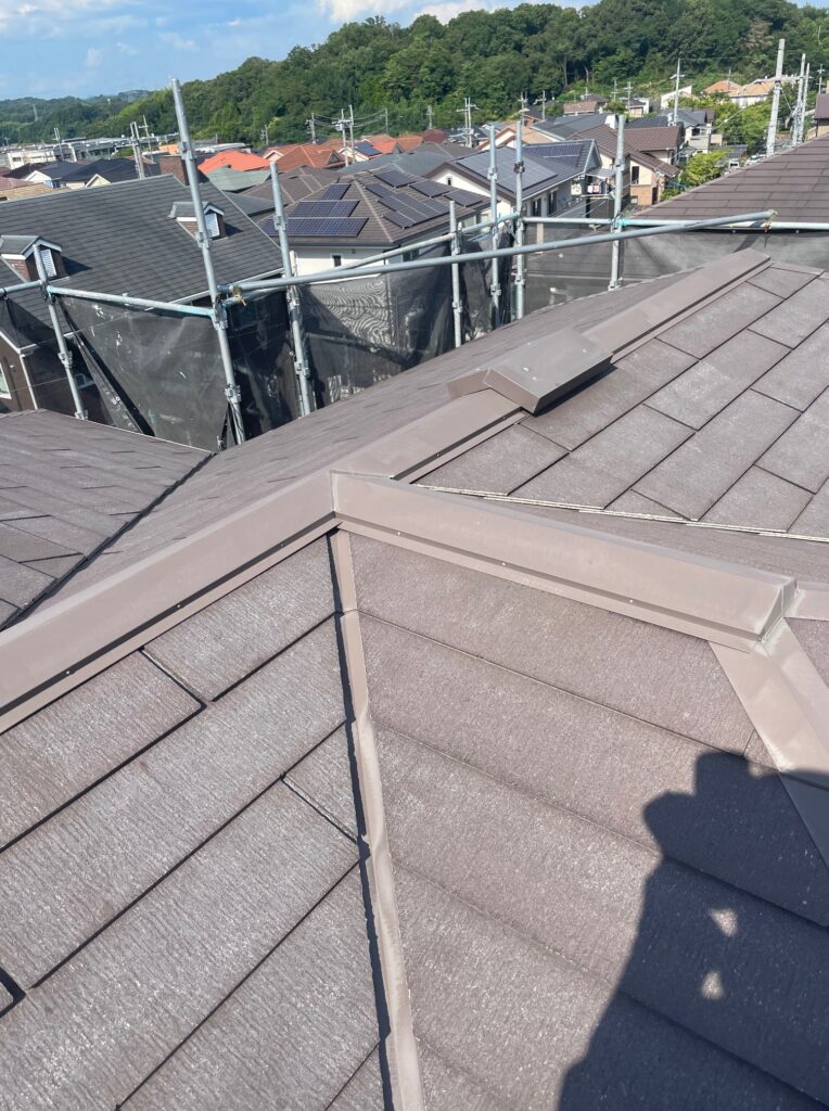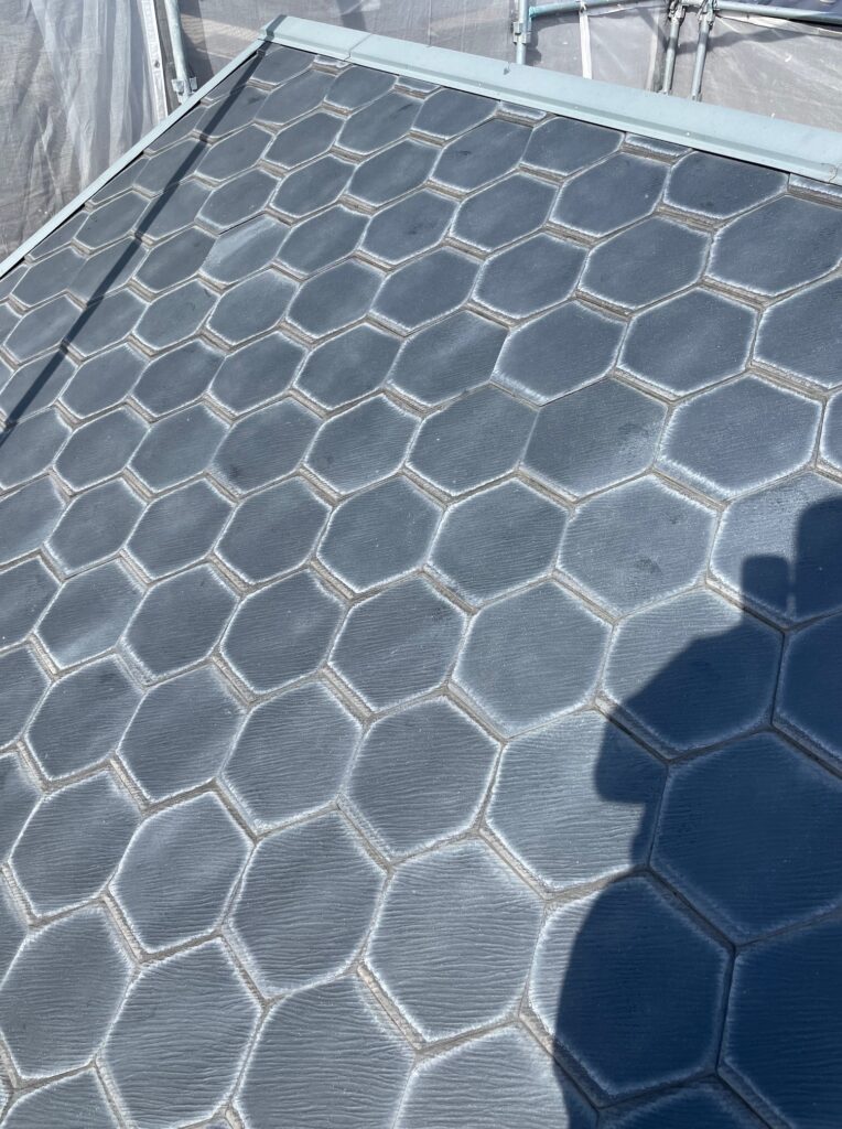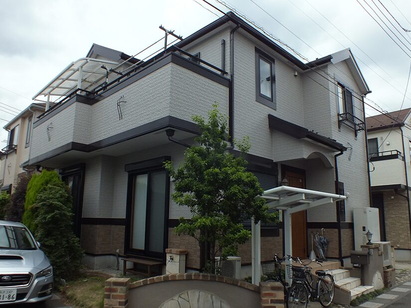 ・上塗り1.2回目 – ニッペ グランセラトップを使用。高耐候性、超低汚染性、強力防藻-防カビ機能があり、無機塗料であるため耐久性もバツグン。退色、コケやカビ、雨だれの発生を防止する。