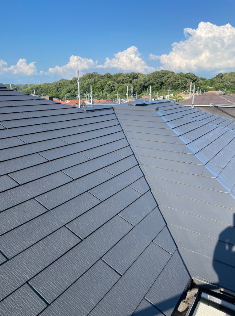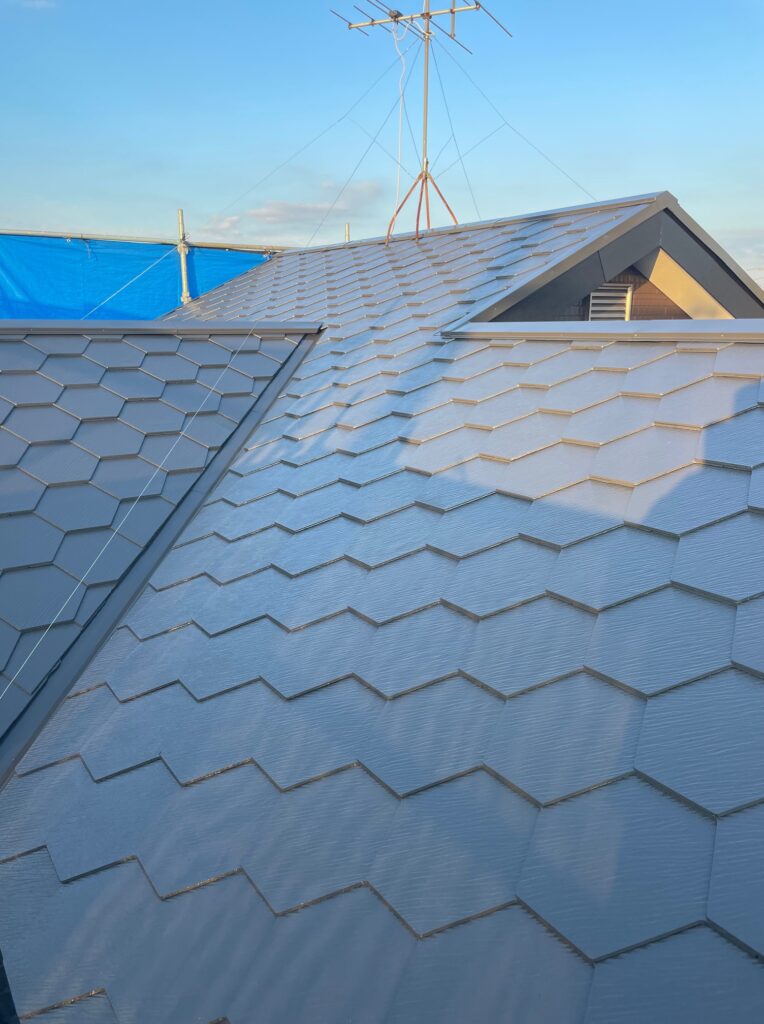 ・上塗り1.2回目 – グランセラベスト2液ファイン遮熱を使用。遮熱効果に加えて、耐候性が高く、防藻-防カビ機能もあるため、熱を反射し、汚れにくく、耐久性にも優れている。