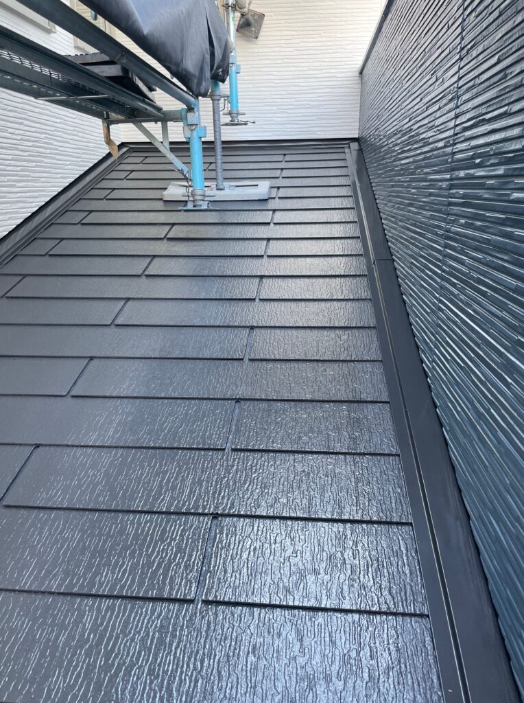 板金部分の塗装を行った後、瓦材部分の塗布を行っていくのですが、今回は仮設足場とのからみがあるため、足がつく部分を先に塗布しておき、( * text 4 )乾燥を待ってから足を戻して残りを塗布していきます。( * text 5 )