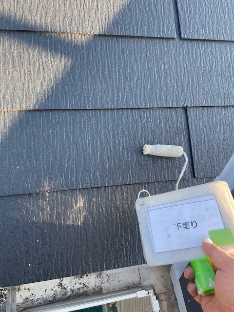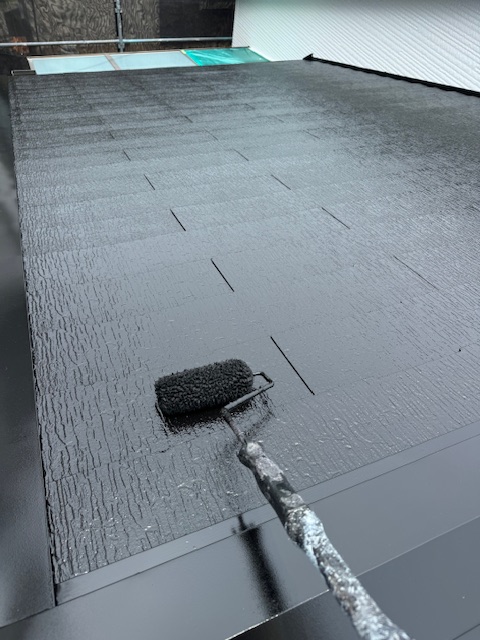 次に下塗りを行っていきますが、屋根材の劣化状態により塗り重ねる回数がかわります。今回は状態が良好なため、強化シーラーを使用し、1回の塗布を行いました。( * text 1 , 2 )