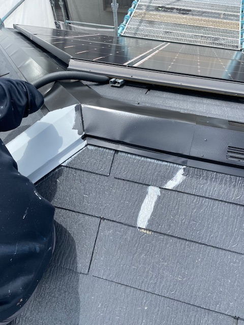 屋根全体の塗装を行う前に、板金部分の上塗りを行います。上塗りの塗り重ね回数は2回です。( * text 4 )