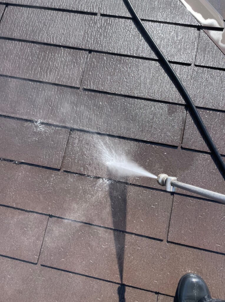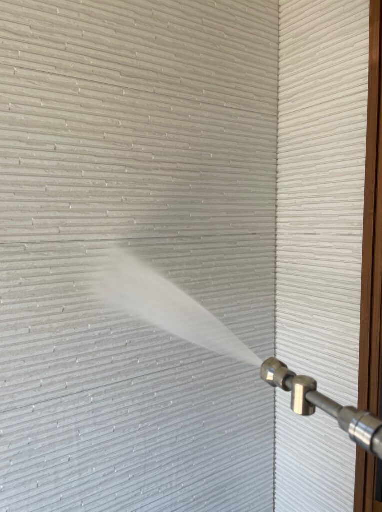 屋根を洗浄後は外壁の洗浄を行っていきます。外壁の洗浄には少し水圧をおさえて洗います。