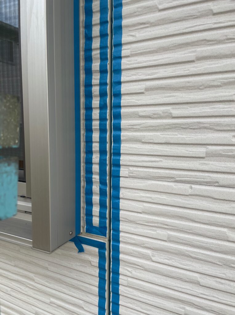 美しい仕上りのためにシールの乾燥前に養生を剝がす必要があり、注入 → 押さえ → 養生撤去を繰り返して作業を行っていきます。( * text 3 )
